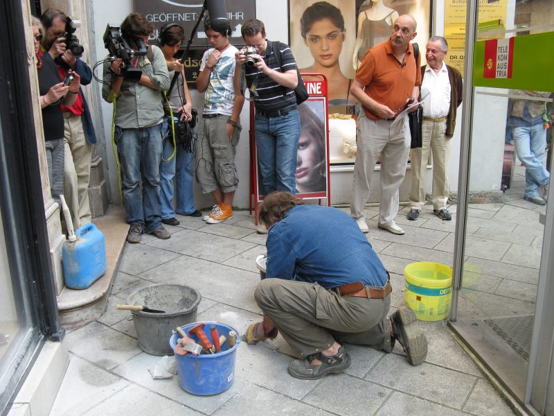 Marko Feingold im August 2008 am Platzl bei der Verlegung der Stolpersteine für das Ehepaar Jellinek, für die die Rudolf Steiner Schule die Patenschaft übernommen hat.