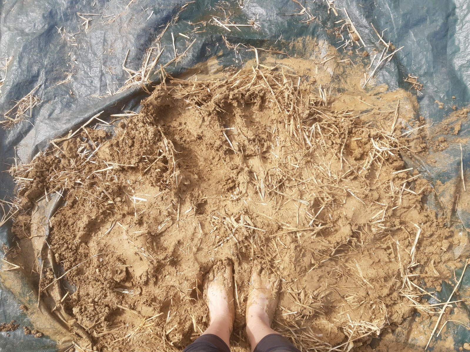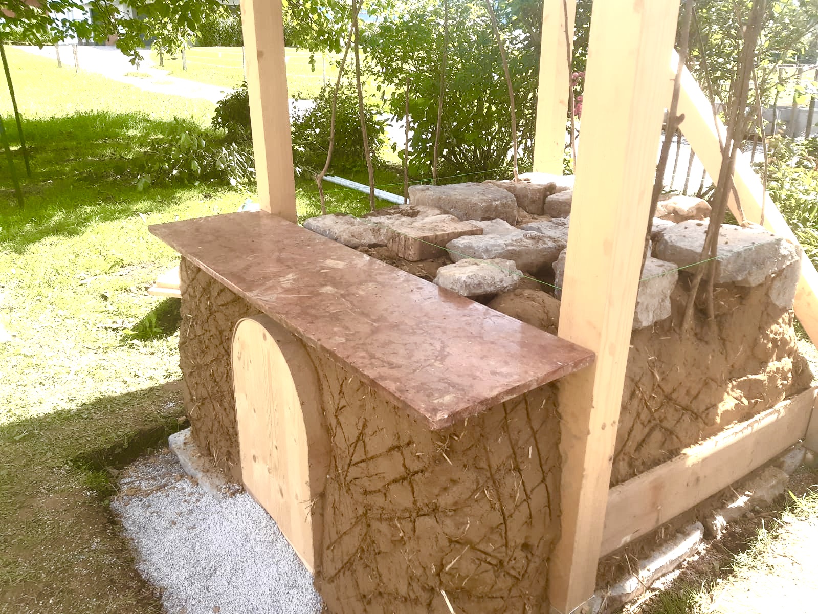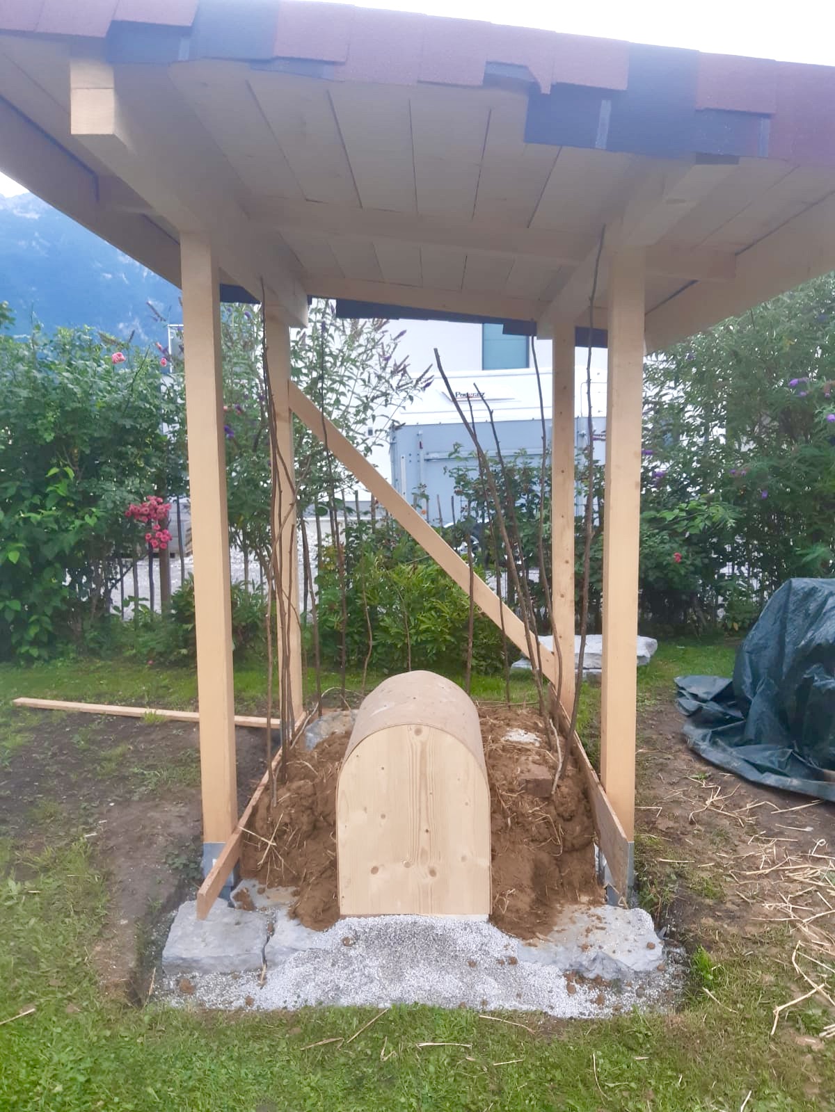Das Fundament für den Ofen bestand aus Kies und Wegsteinen. Mithilfe von Holzschablonen entstanden zwei Gewölbe, eines unten zum Einschlichten von Holz, und ein größeres oben, in welchem man backen und Feuer machen kann. Im oberen wurden außerdem Glasflaschen zur Isolation eingebaut, da somit Hohlräume entstanden, die eine bessere Speicherung der Wärme ermöglichen. Zur Stabilisierung baute ich Haselnusszweige ein, die dem Lehm Halt gaben.