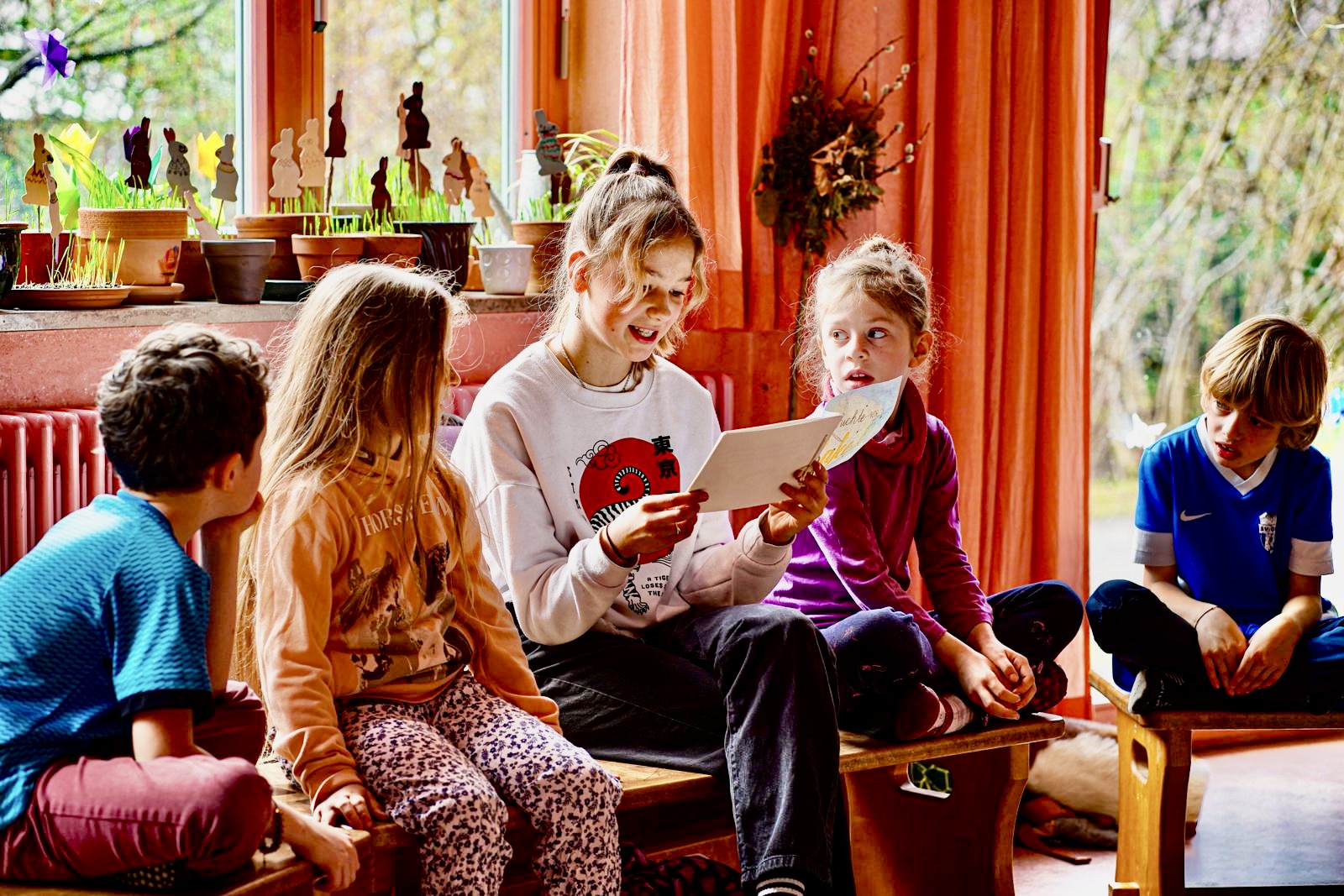 Im Rahmen der Humorepoche hat die 9. Klasse selbst lustige Kinderbücher geschrieben und diese illustriert. Wir haben die 1. Klasse und 2. Klasse dann besucht, um den Kindern die Geschichten vorzulesen. Unsere Jüngsten haben gespannt gelauscht, gelacht und dann herzliches und ehrliches Feedback gegeben.