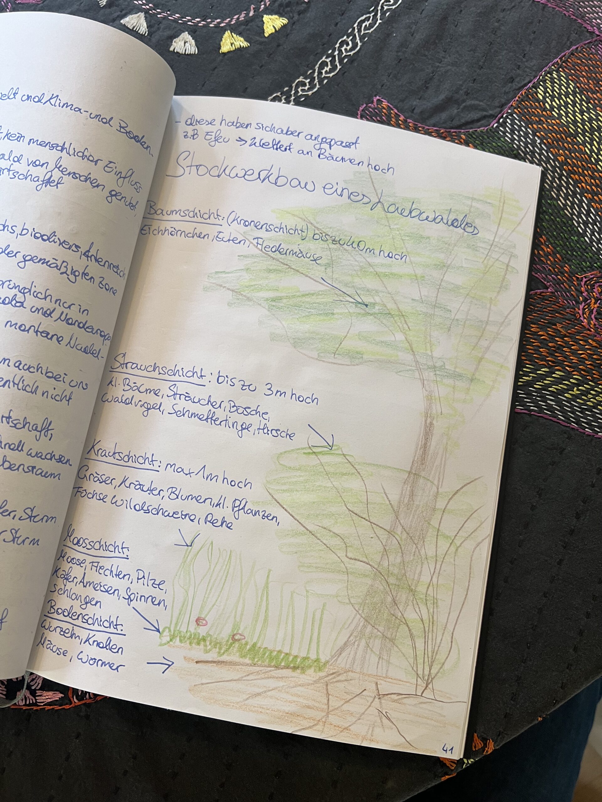 Die Ökologie zwingt uns vernetzt zu denken – in die Tiefe zu gehen. Komplexe Systeme brauchen Zeit und ein sich Einlassen können, um durchschaut zu werden. Lineare Antworten, nach dem Motto „wenn – dann“ sind oft zu schnell gegeben. So wollen wir uns verlangsamen, das Gehen hilft uns dabei. Doch wie können wir uns besser einlassen? Die Natur selbst hilft uns dabei. Der Wald beispielsweise zeigt uns seinen Stockwerksbau und seine ökologischen Nischen. Wie gut tut es, an einem heißen Sommertag, die Kühle des Waldes zu genießen. So kommen wir auf die Funktionen des Waldes zu sprechen. Einen Forst sehen nun alle Schüler mit anderen Augen, es fehlt die Artenvielfalt und vieles mehr, die wir schon zuvor in anderen Wäldern (Bergwäldern, Auwäldern) entdeckt haben.