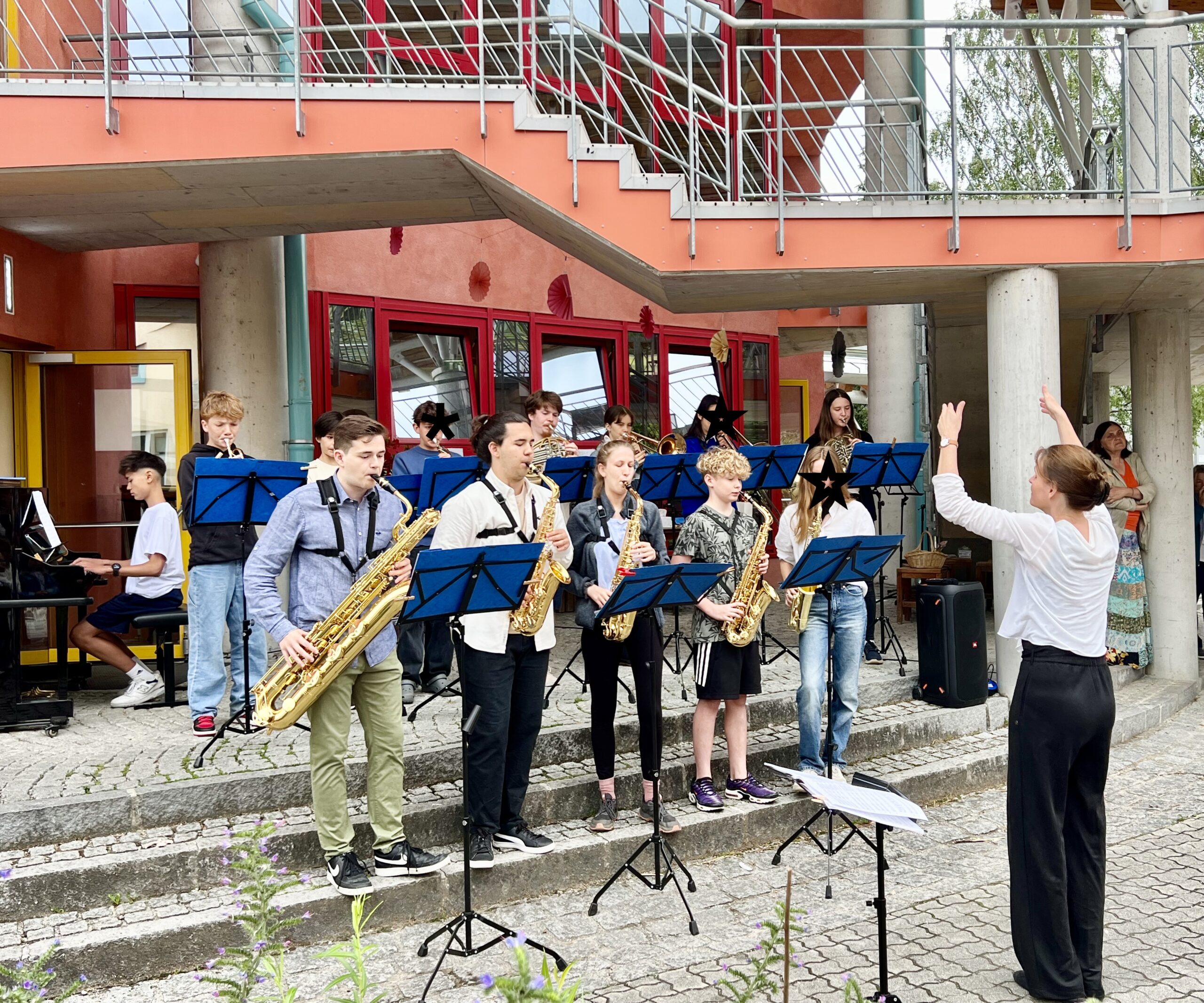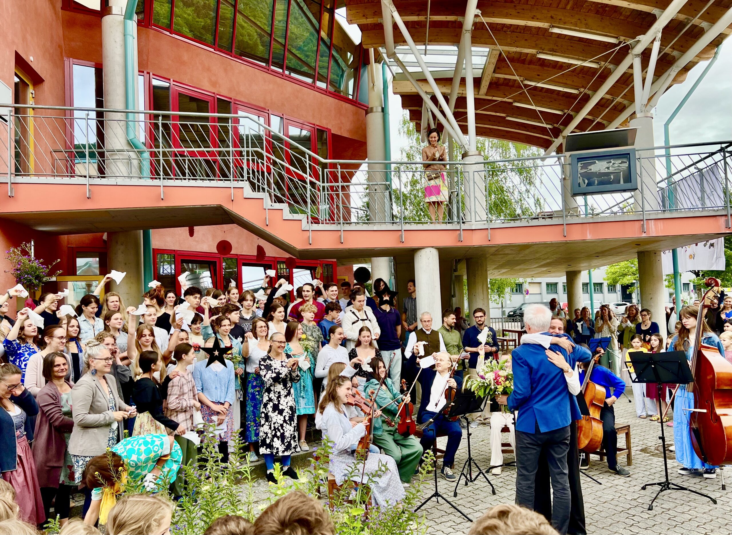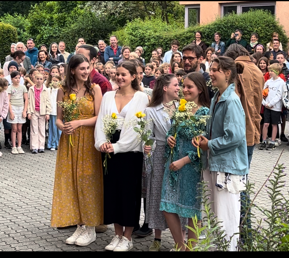 Der letzte Schultag an der Waldorfschule ist ein unvergesslicher Moment, der gemeinsam gefeiert wird: Alle versammeln sich im Schulhof, die Big Band spielt, und es wird den vielen Menschen gedankt, die im Hintergrund mit Herzblut für die Schule arbeiten. Pädagog:innen, die in den Ruhestand gehen, in den Mutterschutz oder aus anderen Gründen den Campus verlassen, werden gebührend gefeiert und verabschiedet. Die ganze Schulgemeinschaft singt zusammen, und dabei wird die eine oder andere Träne der Rührung verdrückt.