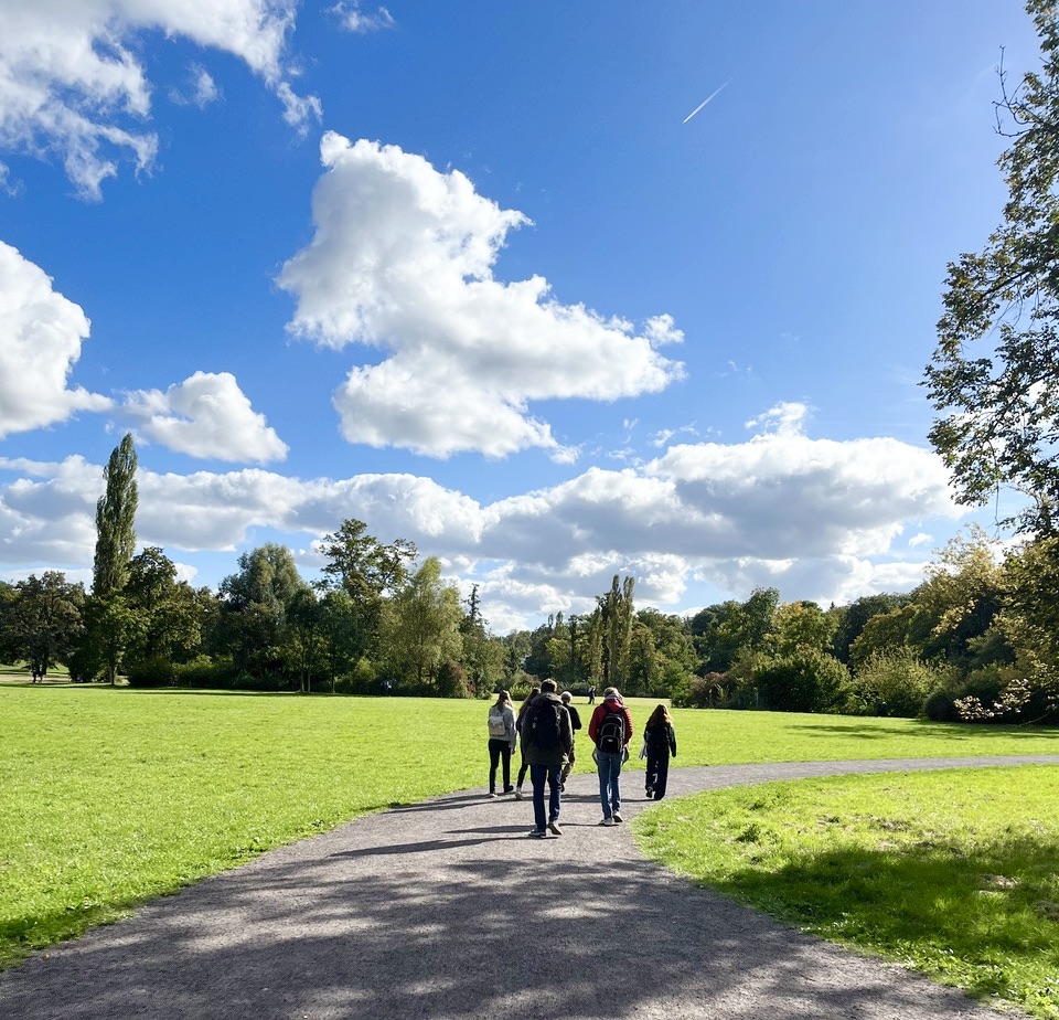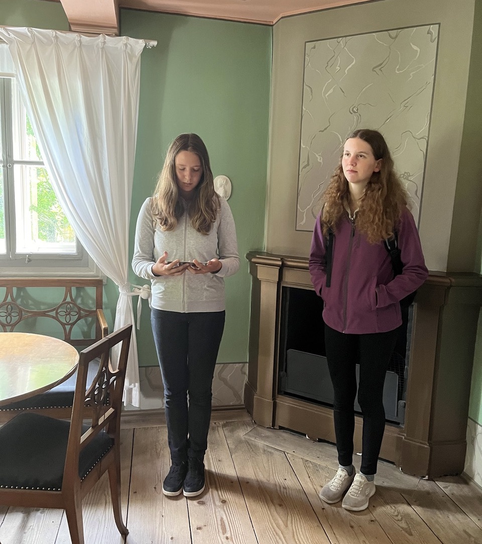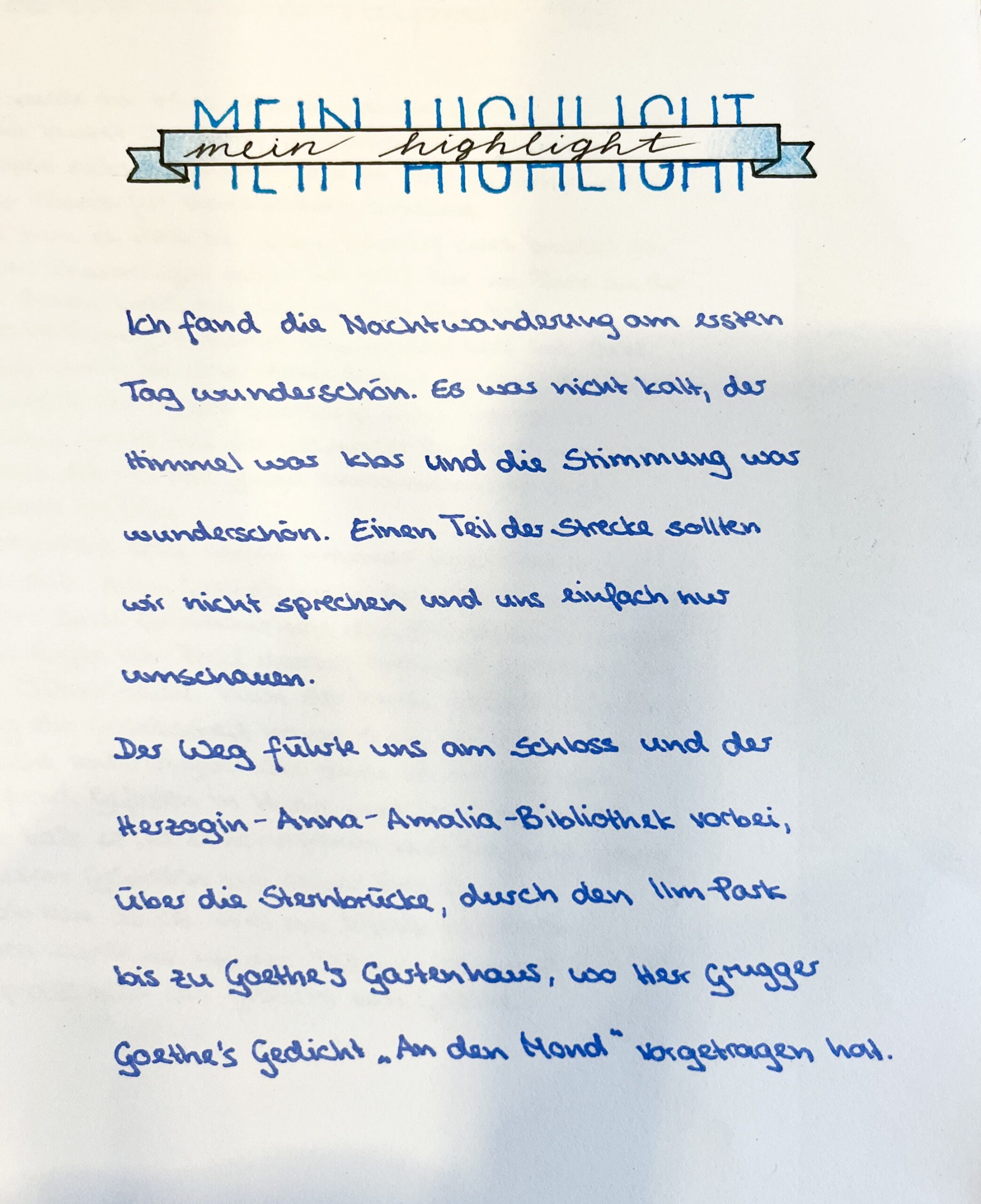 Ich fand die Nachtwanderung am ersten Tag wunderschön. Es war nicht kalt, der Himmel war klar und die Stimmung war wunderschön. Einen Teil der Strecke sollten wir nicht sprechen und uns einfach nur umschauen. Der Weg führte uns am Schloss und der Herzogin-Anna-Amalia-Bibliothek vorbei, über die Sternbrücke, durch den Ilm-Park bis zu Goethes Gartenhaus, wo Herr Grugger Goethes Gedicht „An den Mond“ vorgetragen hat.