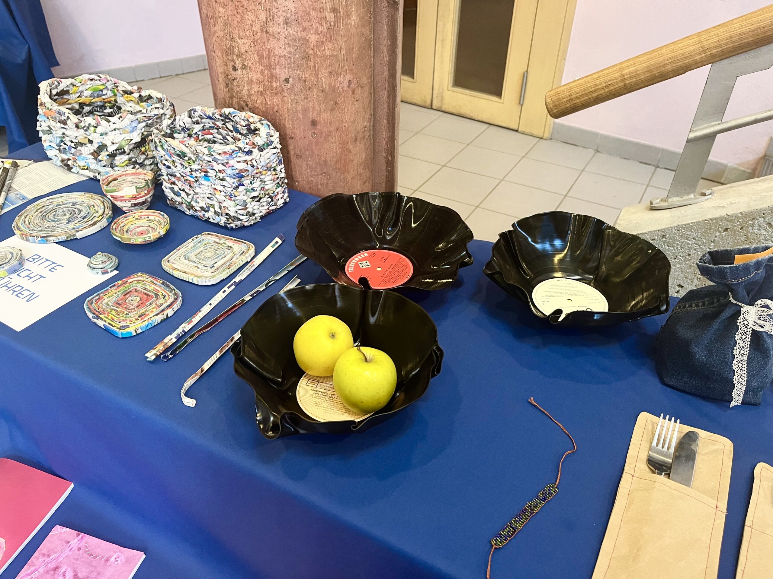 Wir nützten unsere Inspiration, um aus nicht mehr gebrauchten Gegenständen Neues zu gestalten. Dabei verwandelten wir Altpapier zu Körben, Untersetzer, Windlichter, Hefte, Karten und Sterne. Stoffreste verwebten wir zu Teppichen und Kissen. Alte Jeans und Hemden verwandelten sich zu