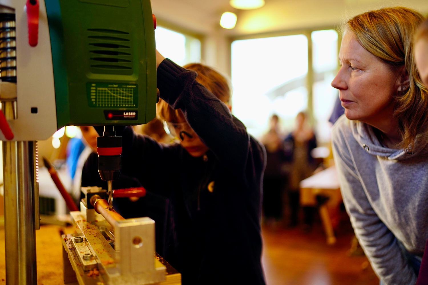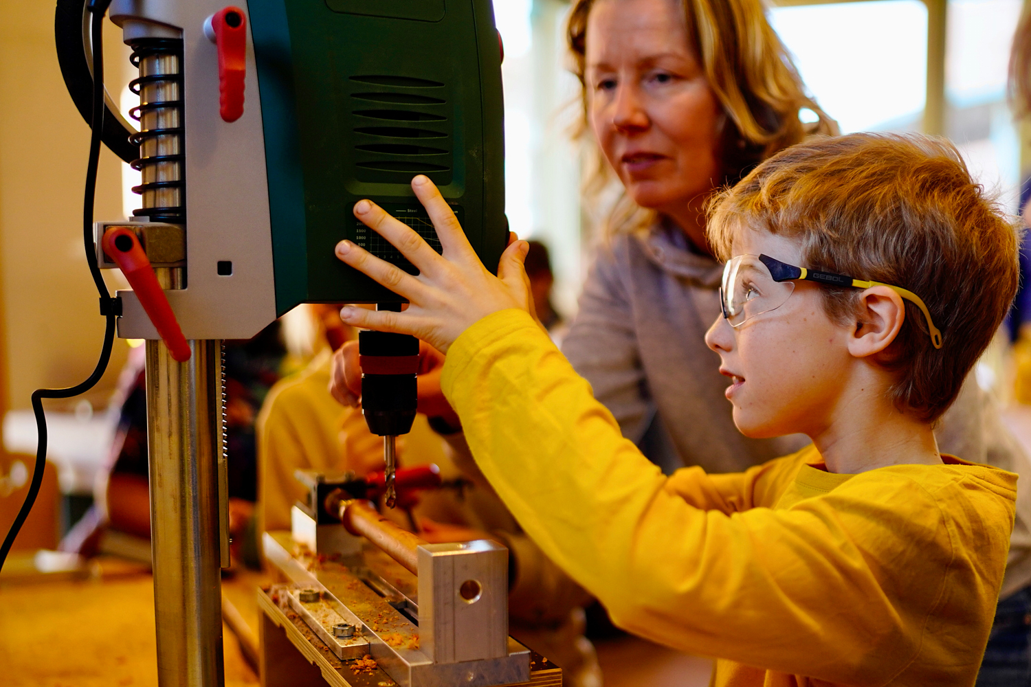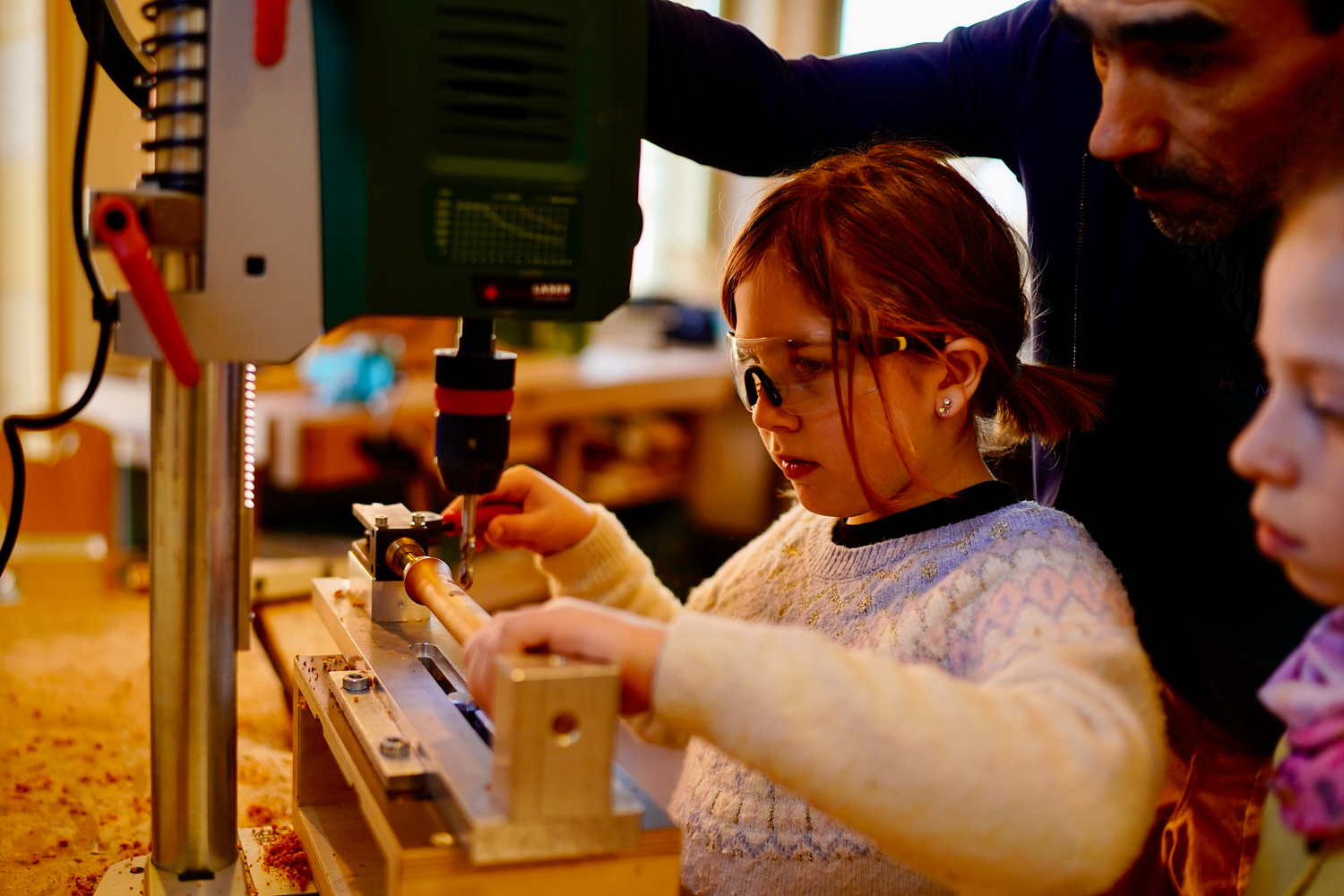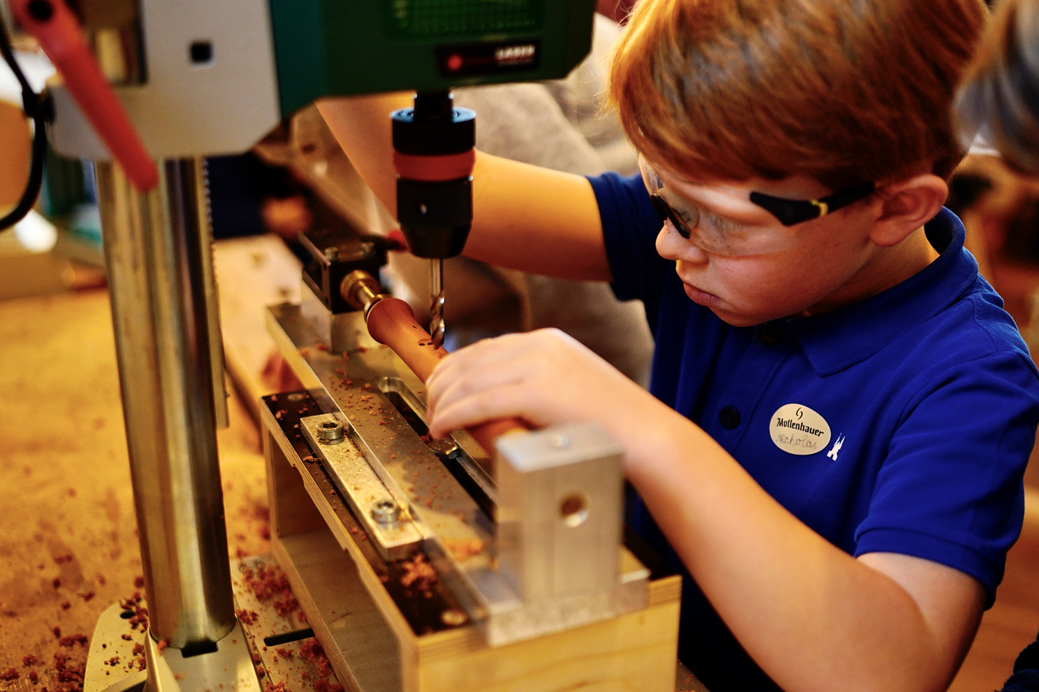 Dann wurde es ernst und richtig aufregend. Zuerst bauten die Kinder sogenannte „Schnurrbart-Schleifer“, mit denen die Flöten innen geschliffen wurden. Danach ging es weiter in die Werkstatt: Jedes Kind durfte die Löcher seiner eigenen Flöte bohren.