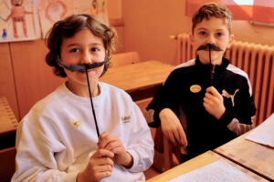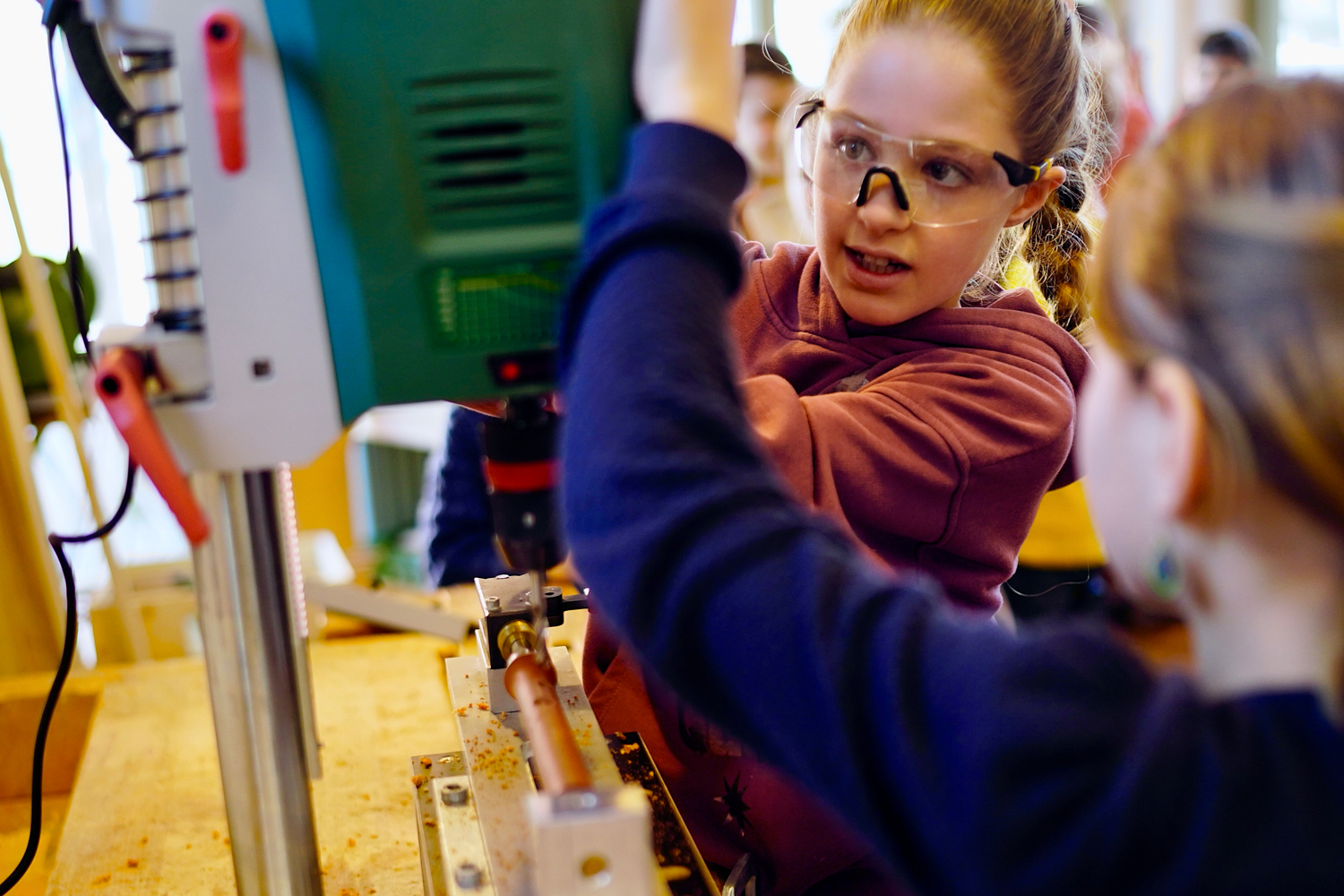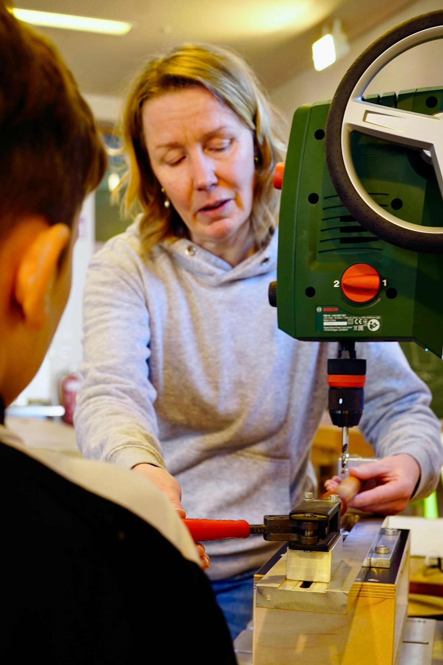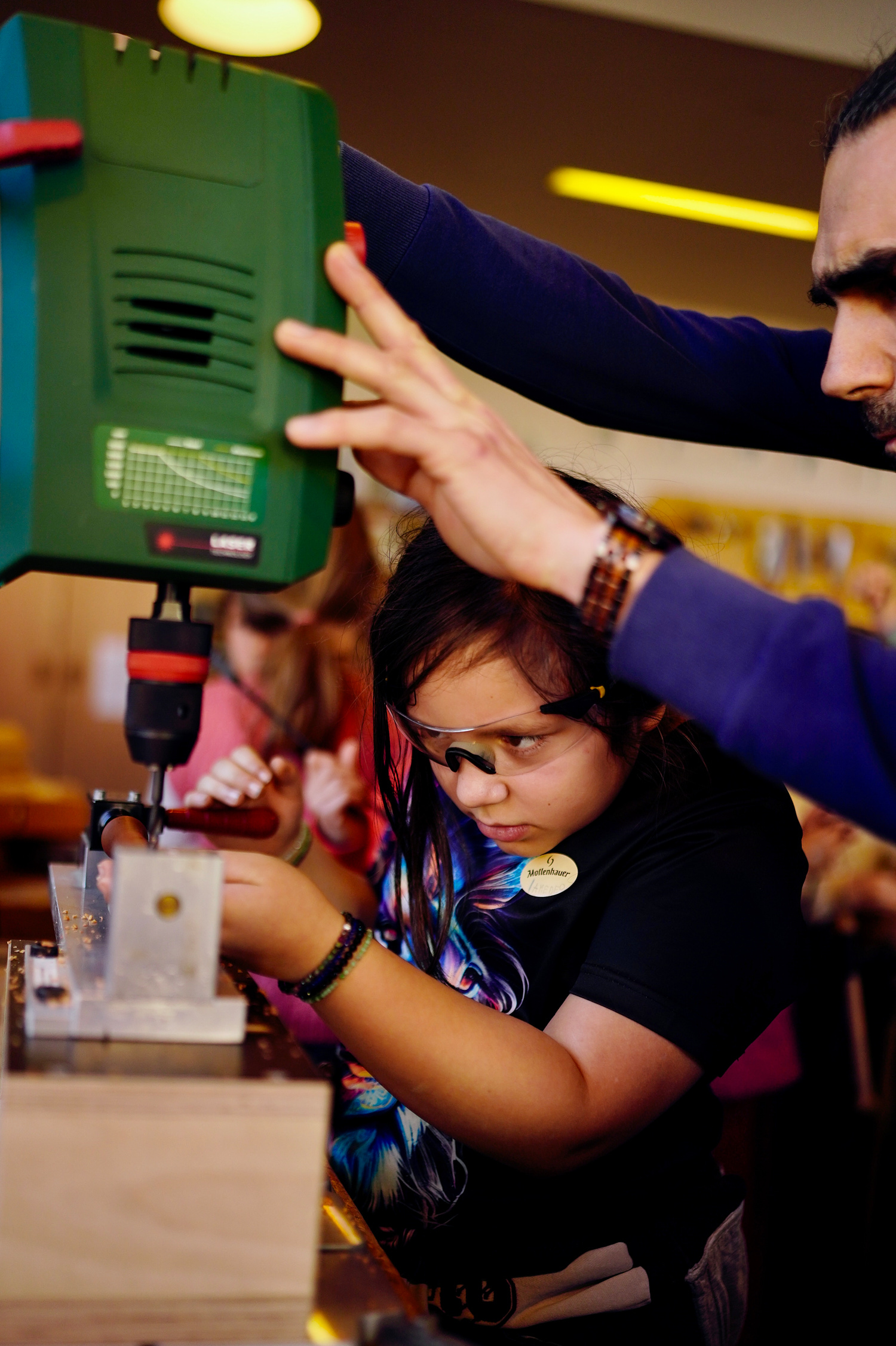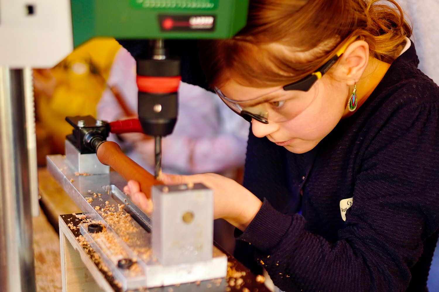 Dann wurde es ernst und richtig aufregend. Zuerst bauten die Kinder sogenannte „Schnurrbart-Schleifer“, mit denen die Flöten innen geschliffen wurden. Danach ging es weiter in die Werkstatt: Jedes Kind durfte die Löcher seiner eigenen Flöte bohren.