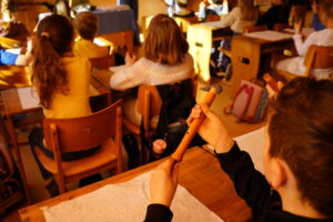Bevor es in die Werkstatt ging, hielt Frau Mollenhauer in der Klasse eine kindgerechte und sehr informative Einführung ins Flötenbau-Handwerk. Sie zeigte den Kindern, wie eine Flöte von innen aussieht, erklärte, wie der Ton entsteht, und erzählte Spannendes über das Labium und den Flötenblock aus Zedernholz.